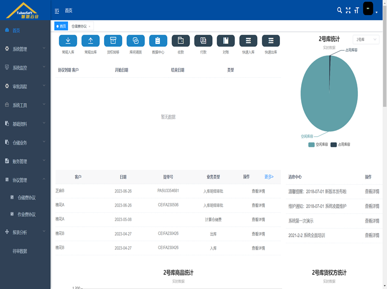 功能:仓储数据综合分析,出入库、调拨、盘点等操作管理,定期巡检计划,自动生成库存总账及明细账,自动计算仓储费及作业费,实时监管,双端使用。